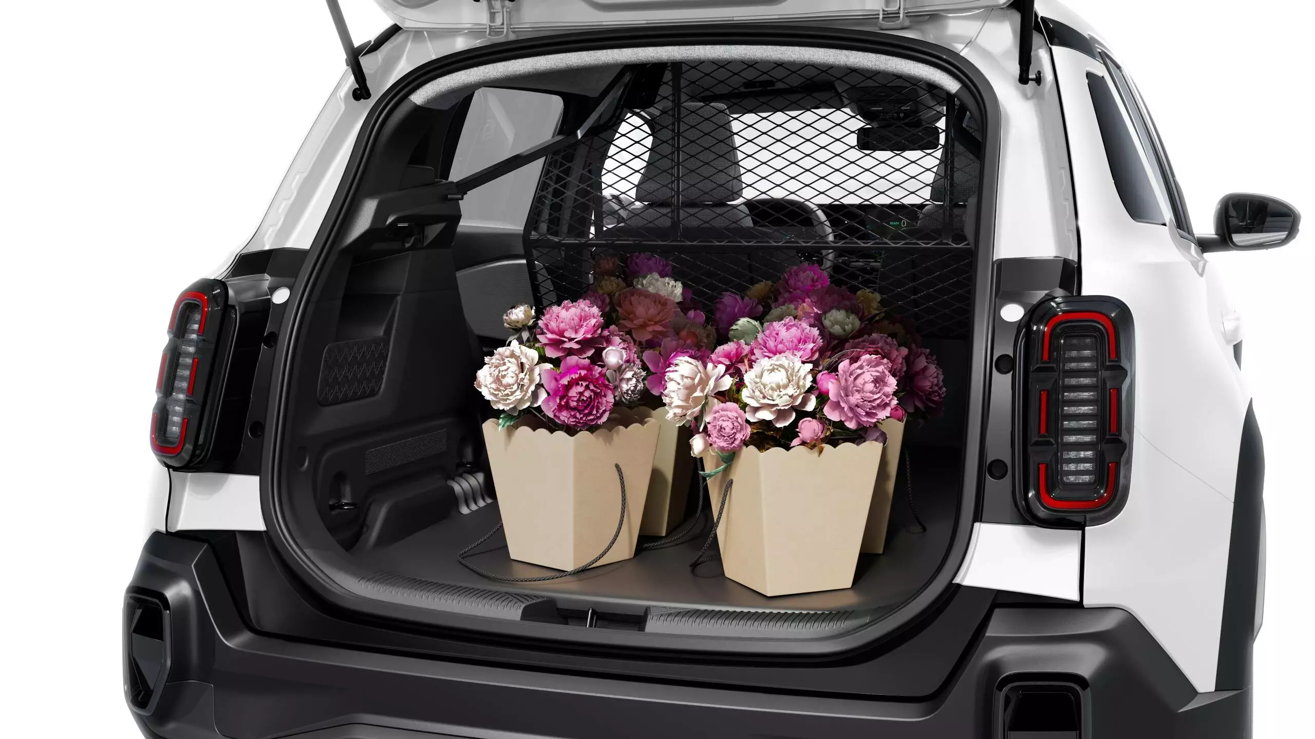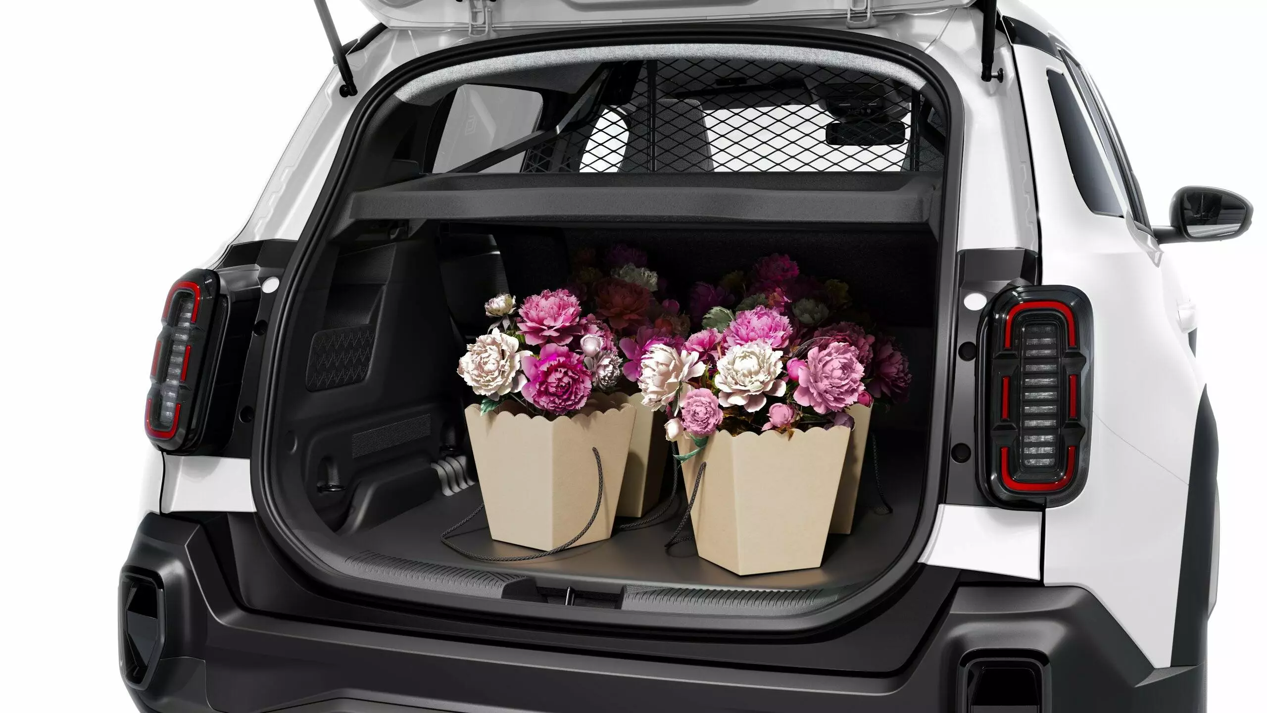 Met een systeem om de lading vast te zetten én met sjorogen. Dat houdt de auto netjes.